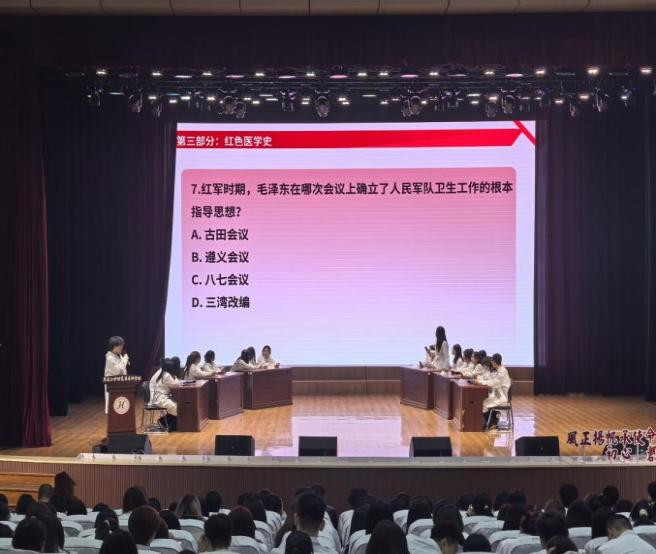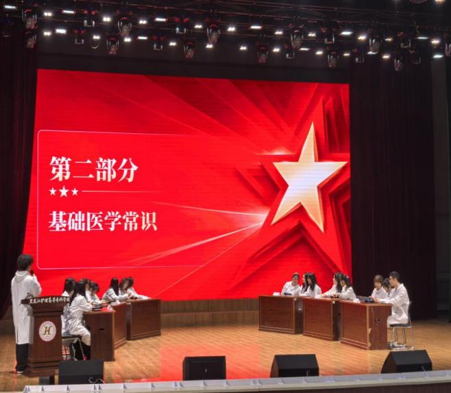本次竞赛以“以赛促学、以学促行”为核心,融合党史、红色医学史与基础医学常识,分预赛、决赛开展。预赛通过学习通线上笔试选拔18名优秀选手,晋级选手自主组队成6支代表队,在学校天使剧场展开现场对决。决赛设抢答、分享两大环节,抢答环节各队争先作答,现场氛围热烈;分享环节选手讲述红色医者与医药发展故事,让师生深切感悟红医精神内涵。